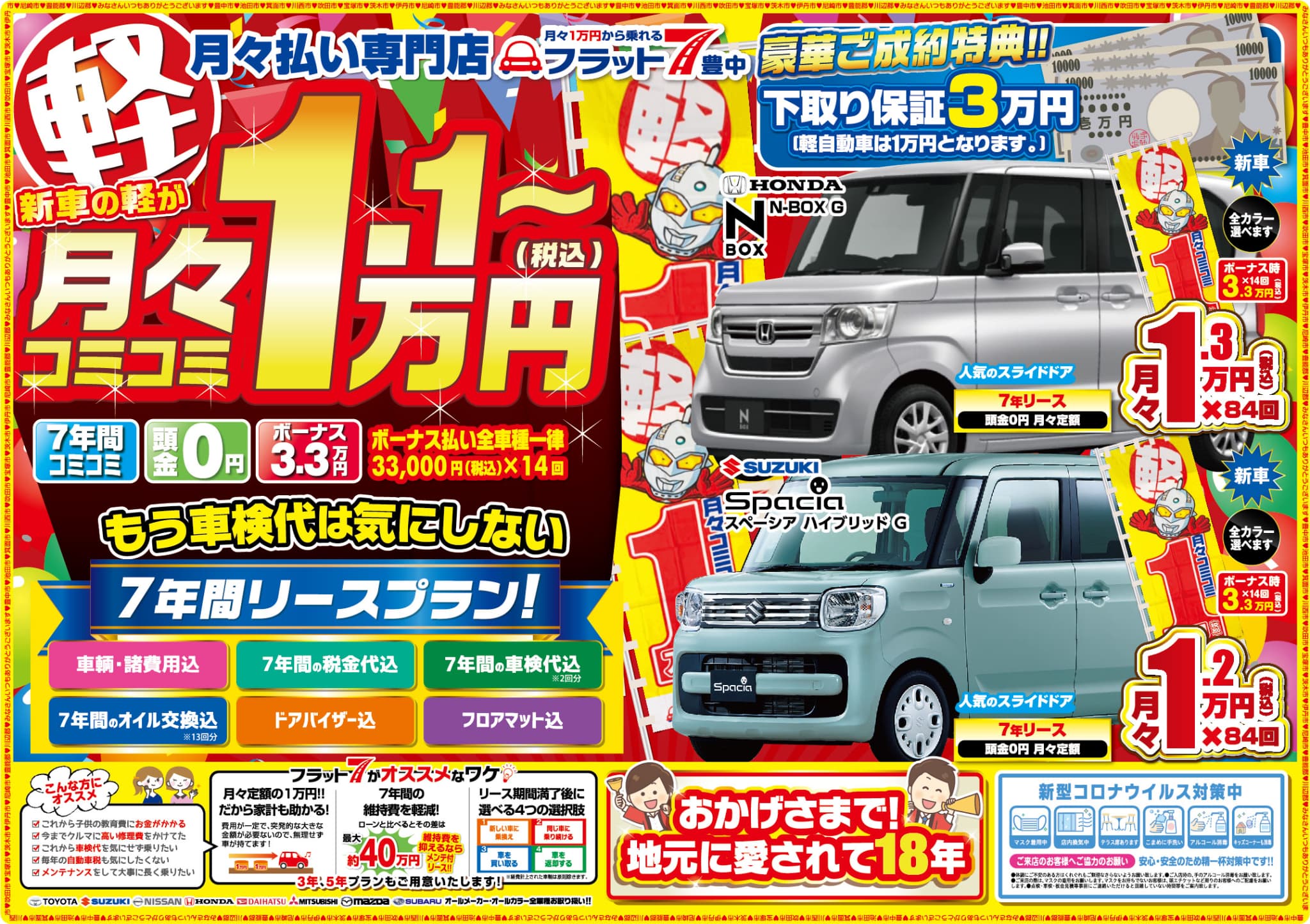 フラット7は、全カラー、全メーカー(スズキ、ホンダ、ダイハツ)、全グレードを自由に選べます。